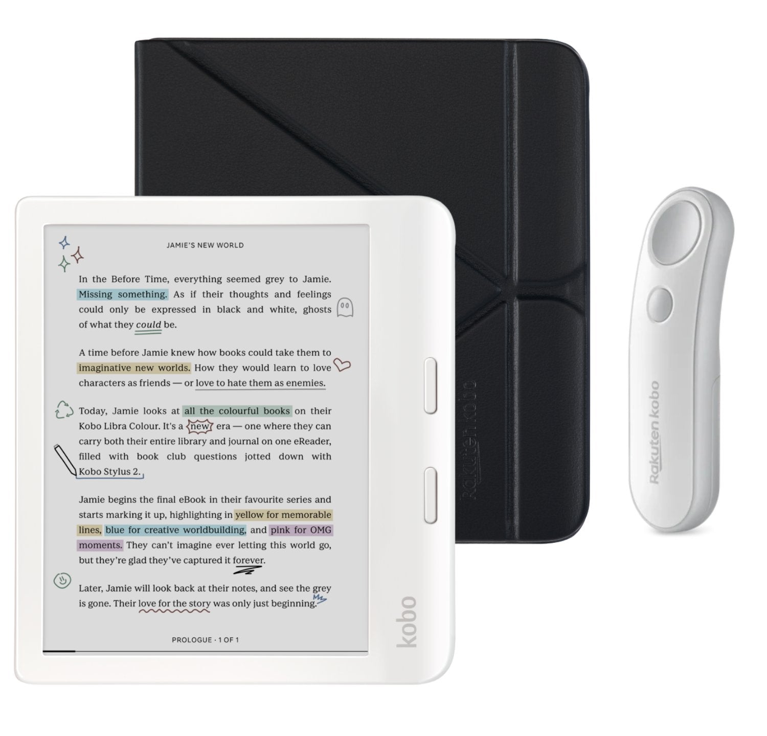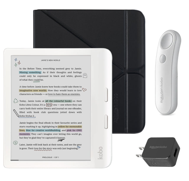 Kobo Libra Colour (White) eReader with SleepCover & White Remote Page Turner Bundle - Black SleepCover / Case + Remote + AC Bundle is backordered and will ship as soon as it is back in stock.
