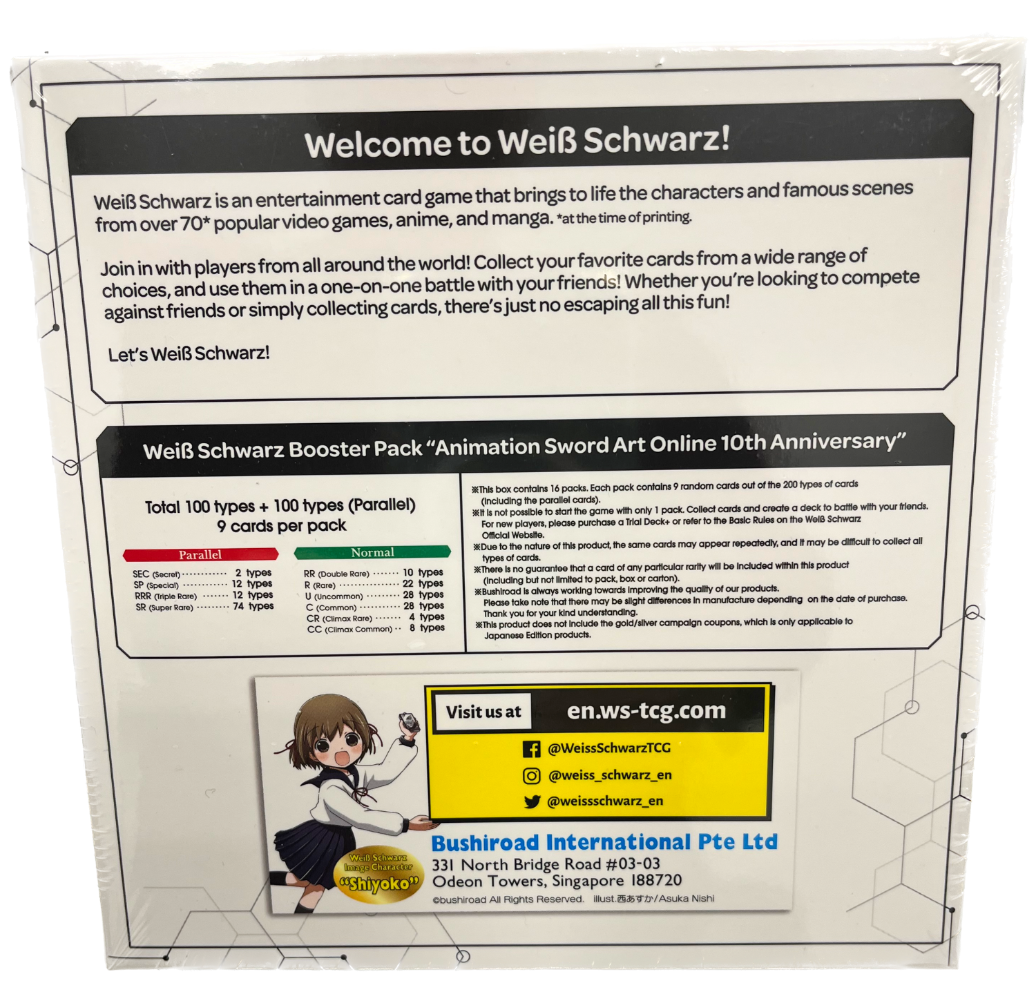 Celebrate a decade of adventure and camaraderie with the Weiss Schwarz: Trading Card Game Sword Art Online 10th Anniversary Booster Box. This special edition booster box is a must-have for fans of the iconic series, offering a deep dive into the world of Aincrad and beyond. Packed with 16 thrilling packs, this booster box invites you to relive the unforgettable moments and legendary battles that have defined Sword Art Online. Each pack not only features fresh illustrations of your favorite characters but also holds the potential to unveil exclusive sign cards, autographed by the original cast members like Yoshitsugu Matsuoka (Kirito) and Haruka Tomatsu (Asuna). Perfect for collectors and players alike, this booster box allows you to craft your dream deck and experience the magic of Sword Art Online all over again.