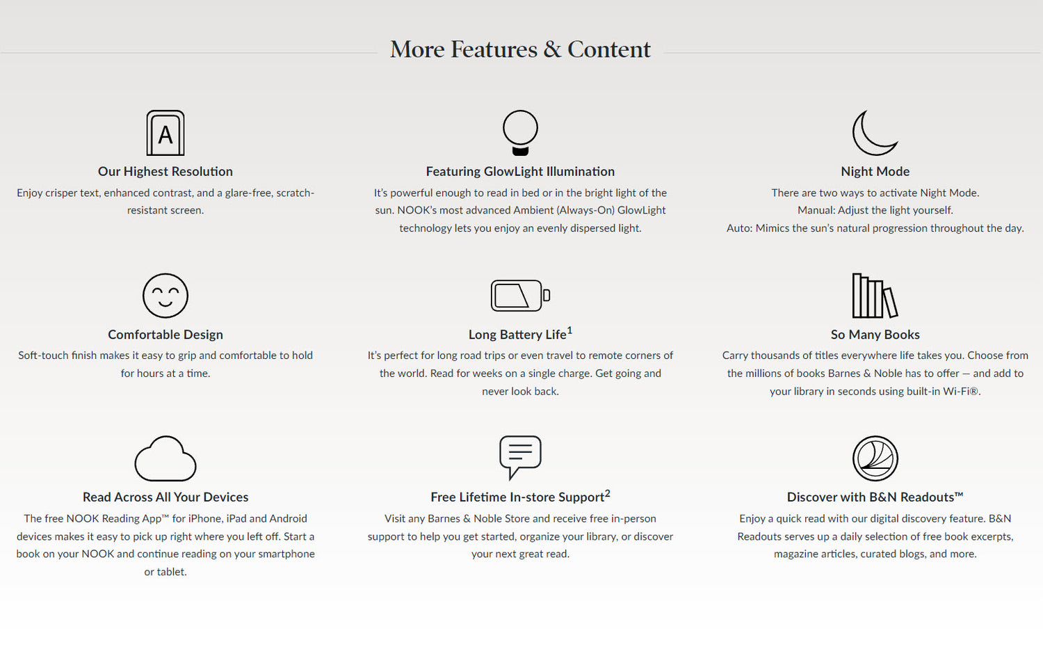 A 6 inch high-resolution 300-dpi screen with built-in glare- scratch- and fingerprint-resistant lens provides a paper-like reading experience. It’s powerful enough to read in bed or in the bright light of the sun. NOOK’s most advanced Ambient (Always-On) GlowLight technology lets you enjoy an evenly dispersed light. Carry thousands of titles everywhere life takes you. Choose from the millions of books Barnes & Noble has to offer and add to your library in seconds using built-in Wi-Fi.