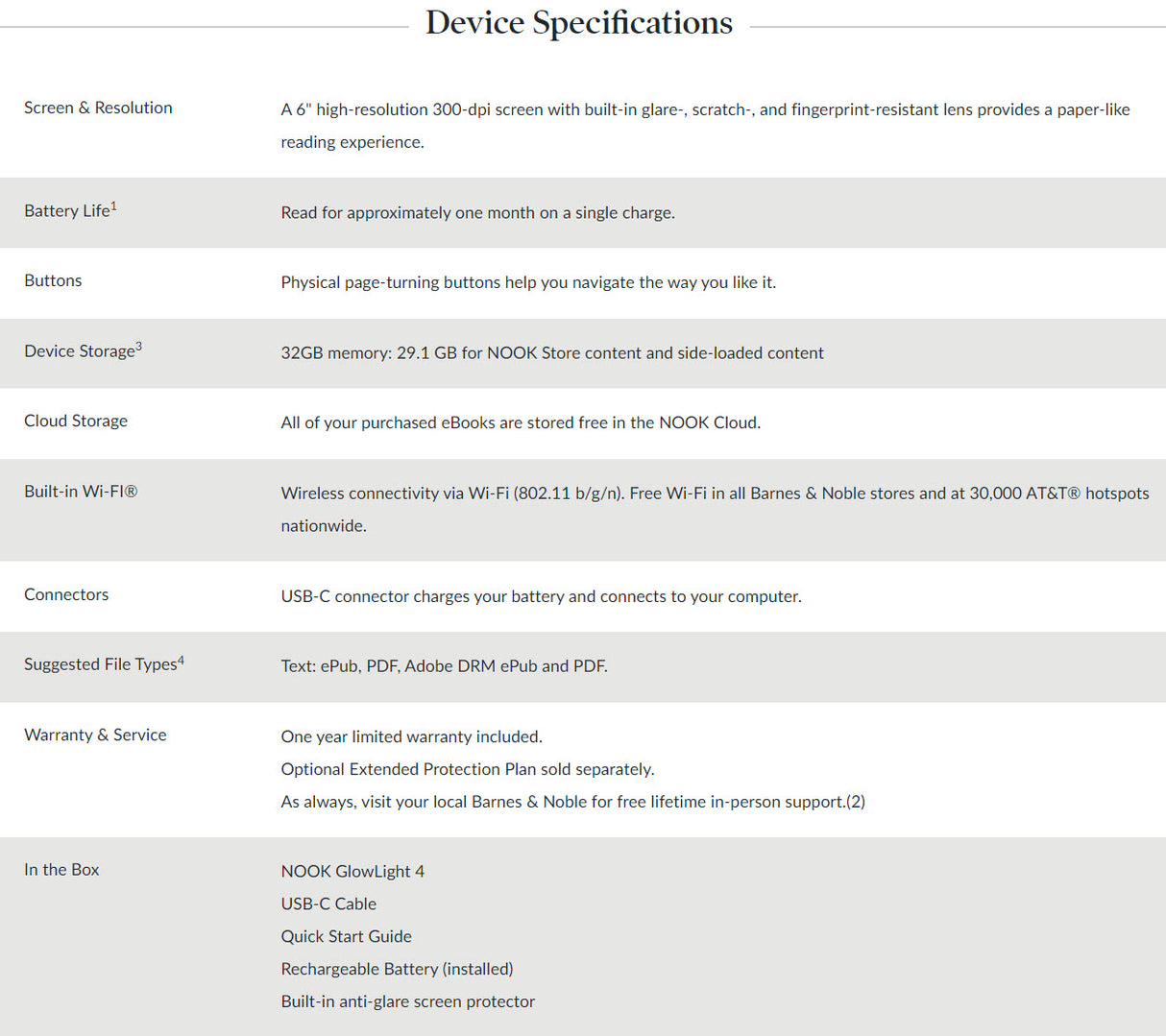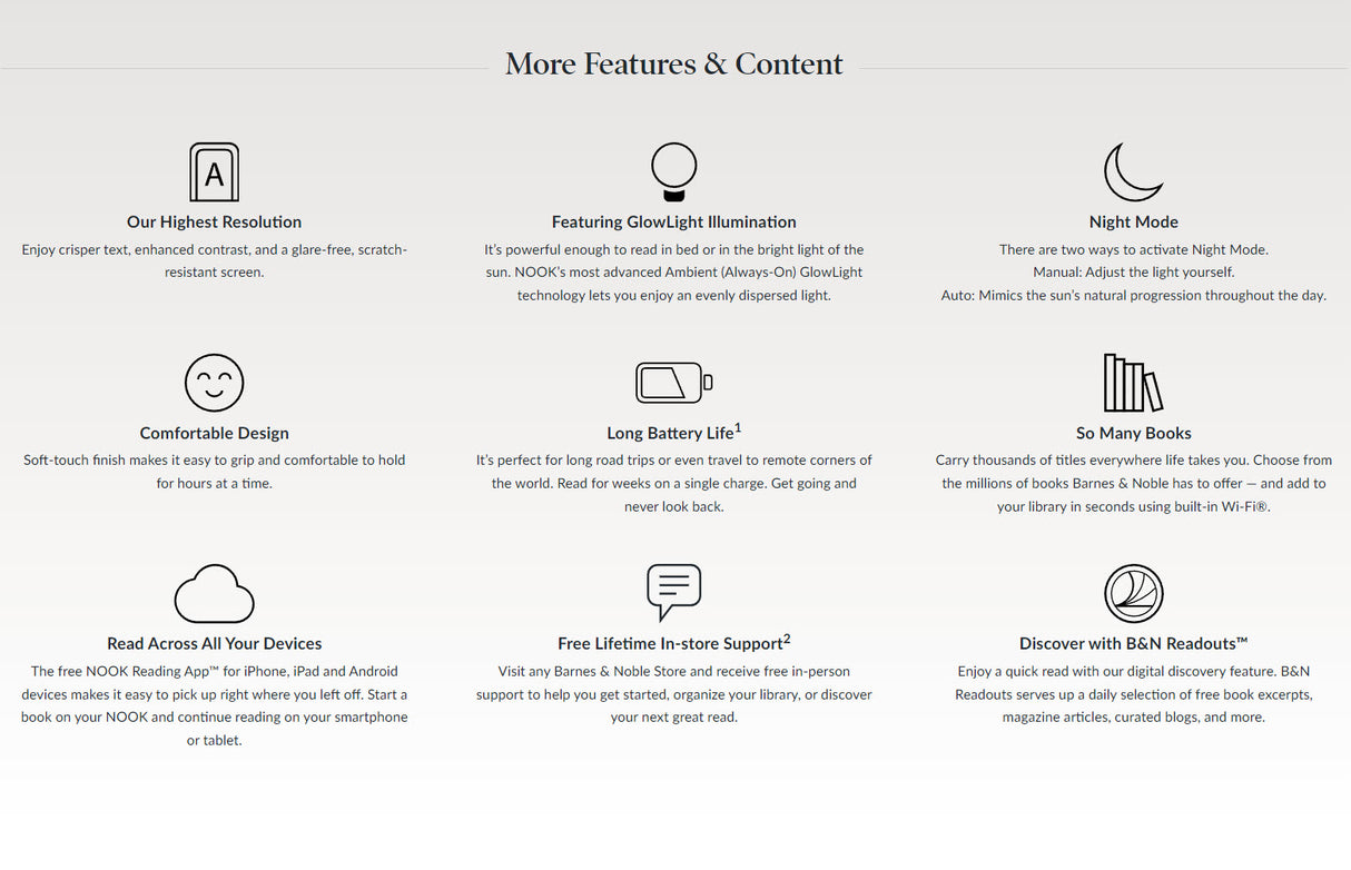 A 6" high-resolution 300-dpi screen with built-in glare- scratch- and fingerprint-resistant lens provides a paper-like reading experience. It’s powerful enough to read in bed or in the bright light of the sun. NOOK’s most advanced Ambient (Always-On) GlowLight technology lets you enjoy an evenly dispersed light.