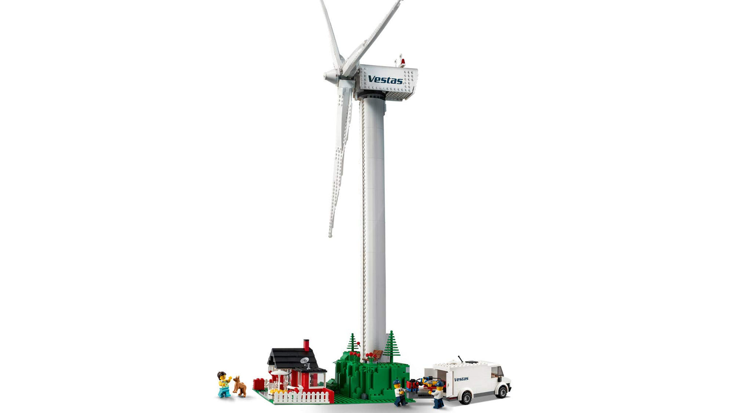 - This big LEGO set also includes 3 minifigures: a woman and 2 Vestas service technicians, plus a dog figure