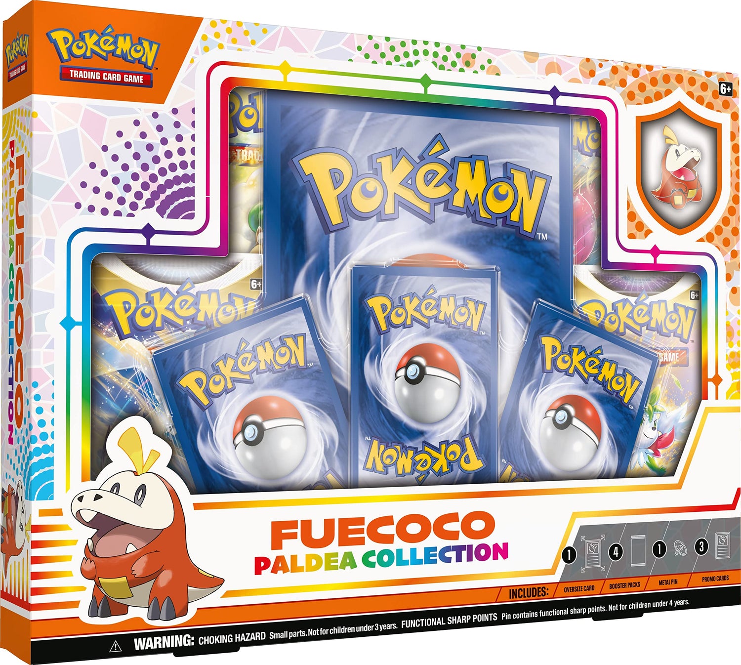 Unleash the excitement of Pokemon TCG with the Paldea Collection! This exclusive set comprises three captivating foil promo cards, an oversized card featuring either Koraidon ex or Miraidon ex, a unique collectors pin showcasing Sprigatito, Fuecoco, or Quaxly, and four booster packs to fuel your Pokemon adventures. Each Paldea Collection is a mystery, adding an element of surprise to your Pokemon TCG experience. Elevate your collection with this special edition that brings together the charm of Sprigatito, the fiery spirit of Fuecoco, and the cool demeanor of Quaxly. Unwrap the magic and dive into the world of Pokemon with the Paldea Collection!