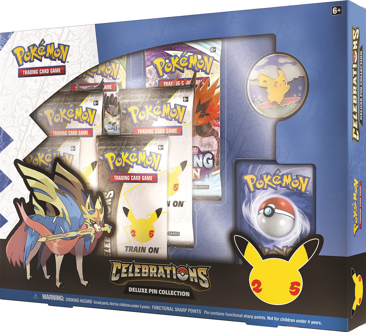 Celebrate Great Adventures and Good Times—with Pokémon!Celebrate Pokémon with the world-famous Pikachu, taking to the waves and the skies on a special pin to commemorate 25 years of good times and great adventures! This well-loved icon of the Pokémon world is part of an amazing collection that includes a special promo card featuring Zacian LV.X, a handful of Pokémon TCG: Celebrations booster packs, and more. Ride the waves and explore the bold blue skies with some of your favorite Pokémon!