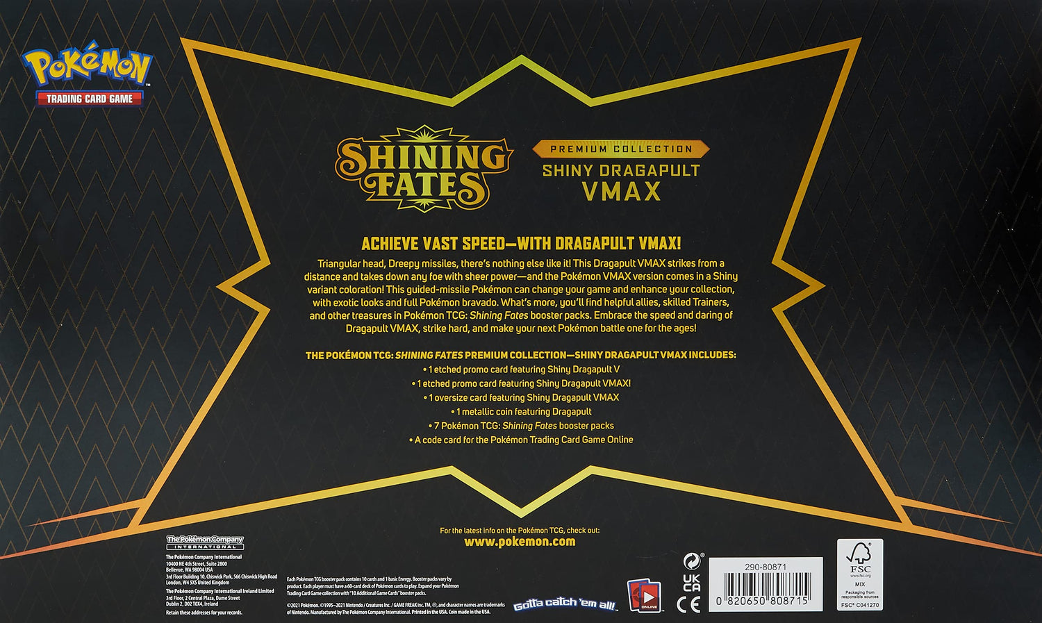 - You will receive, at random, one Pokemon TCG: Shining Fates Premium Collection featuring either Shiny Crobat Vmax or Shiny Dragapult Vmax.