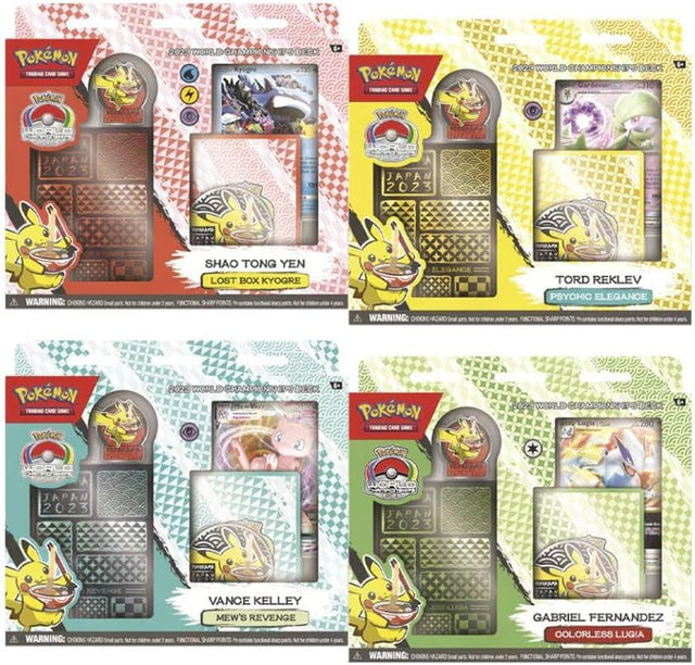 Grab a World Championships deck and play like a champion! These powerful 60-card decks are a replica of the decks the world champions used in the 2023 Pokémon Trading Card Game World Championships! These sets also include a 2023 World Championships deck box, 2023 World Championships coin, and a 2023 World Championships booklet. You will also get a special 2023 World Championships pin, playmat, and poster. You will receive 4 decks, one from each champion (Gabriel Fernandez, Vance Kelley, Tord Reklev and Shao Tong Yen).