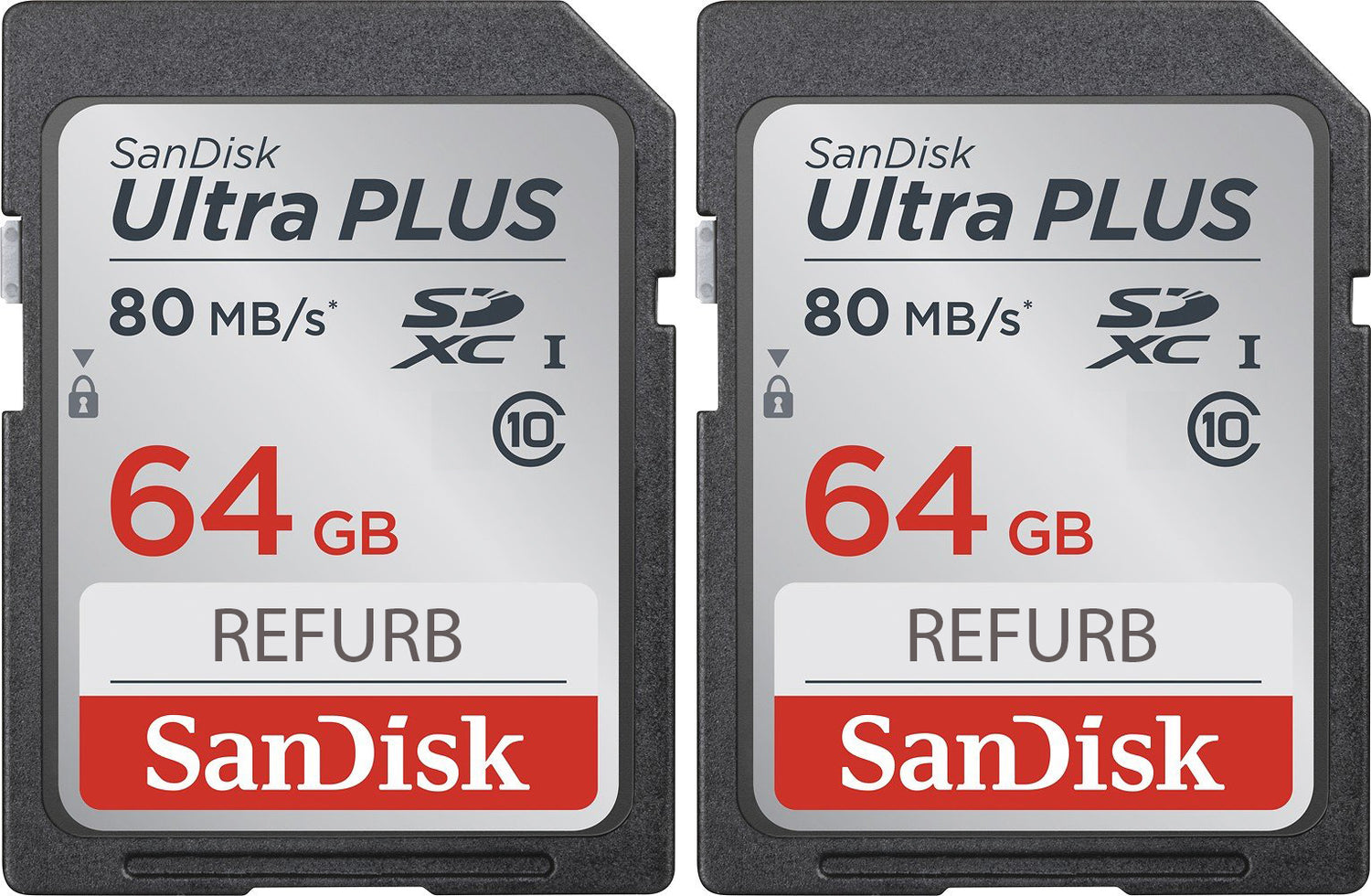 - Pack of 2, SanDisk 64GB Ultra Plus Class 10 UHS-I SDXC Card 80MB/s